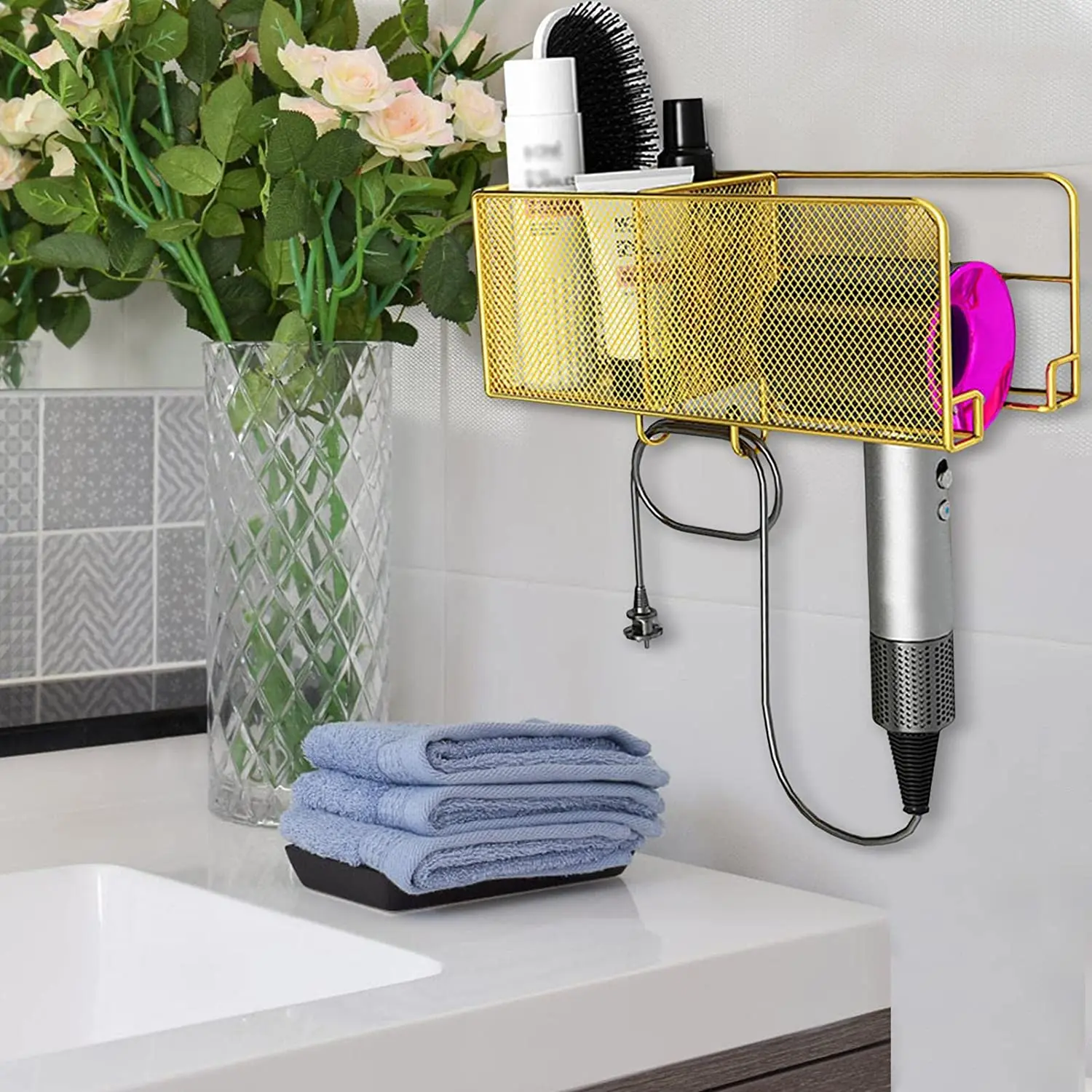Description: Feature: 100% brand new and high quality. Multi Function Storage: Clear up the bathroom of the debris, toothbrush, comb, cosmetics, hair dryer, so that your bathroom clean and tidy, save space. Quantity: 1PC Material: Metal Holder with no nail...